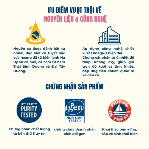 – Nguồn nguyên liệu tinh khiết tự nhiên: dầu cá được chiết xuất từ cá tuyết hoang dã vùng Bắc Cực Na Uy, cá mòi và cá cơm từ Nam Thái Bình Dương rất giàu Omega-3 tự nhiên.